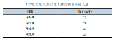 铁元素对人体的营养作用 成年人全身铁的重量为4~5 g,重量相当于1枚小铁钉子。为什么孩子缺铁会对健康造成这么“恶劣”影响呢?因为铁在人体中分布很广,几乎所有的组织中都含有铁,并且铁在人体内参与的“工作项目”,几乎都是“一等一的大事”,包括以下3个。 ● 以血红素铁的形式,参与于血红蛋白、肌红蛋白、脑红蛋白等的合成,负责氧气的储存和运输、二氧化碳的运转、氧气和二氧化碳的交换。 ● 以含铁酶的形式参与细胞能量代谢。 ● 作为多种酶的活性中心,维护人体免疫功能。 宝宝缺铁的预防 在孕期妈妈要摄取足量的铁,增加体内铁储备,保障宝宝出生后足够消耗一段时间(至少6个月)。如果饮食摄入铁有限,就需要额外补铁(与前一个表对比,孕期和哺乳期女性对铁的每日需要量明显增加)