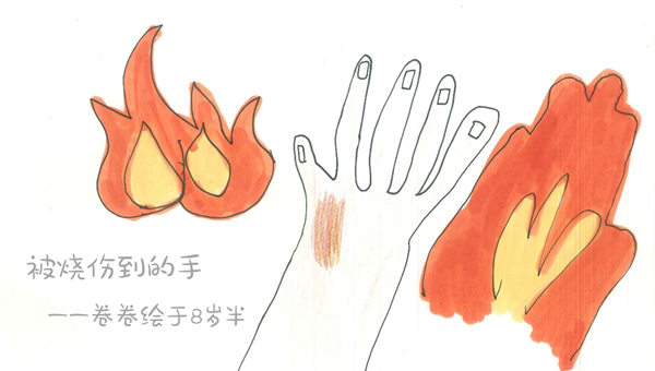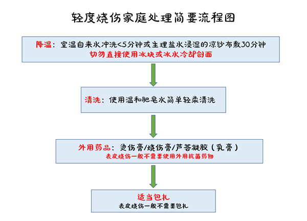 卷卷:“好的,好的!妈妈,那您快告诉我怎么做,我马上背下来!然后抓弟弟也一起背!!” 卷妈:“你不要着急嘛!” 卷卷:“怎么能不着急呢!赶快赶快!” 卷妈思考了一会儿,拿出了一张纸和一支笔,说:“我一边说,一边画,你一边记哦!” 卷卷:“好滴,保证能记得滚瓜烂熟!” 卷妈拿笔敲了一下卷卷的脑袋瓜子,说:“我们家庭处理的烧伤一般是比较轻的烧伤,仅仅是伤及皮肤表皮,也就是表皮烧伤,如果伤得较深的烧伤要尽快到医院就医。当我们被烧伤时,首先要降温,可以用自来水冲洗,也可以用生理盐水浸湿的凉纱布来降温,但是切记不能使用冰块或冰水。然后是清洗,可以用温和的肥皂水简单地清洗,接着可以涂一些如烫伤膏、烧伤膏的药品或芦荟凝胶(乳膏),一般表皮烧伤也可以不用涂,也不需要包扎。” 卷卷:“还有什么其他需要注意的地方吗?” 卷妈:“若烧伤处有水疱的话,可以用非黏性干净的绷带包扎覆盖,每天更换1~2次。不要刺破水疱,否则很容易感染。若伤处疼痛,可试着将烧伤部位抬高至心脏水平以上。比如,脚部烧伤了,可试试躺下来,然后用枕头垫高脚部。还可使用一些非处方的止痛药,如对乙酰氨基酚或布洛芬。还有一个特别重要的地方就是不要搔抓烧伤的位置!” 卷卷:“哦,哦,明白了!” 卷妈:“诺,这就是简单的处置流程图啦,拿去,背好啊!”