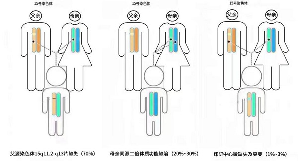 渐渐地,胖娃娃的家长开始不再为自己弱小孩子的成功“逆袭”而沾沾自喜,而是开始出现更多的担心,因为他们发现孩子的食量越来越大,总是嚷着吃不饱,有时候还会发脾气、说谎、与家长对抗、不顾及他人感受、看到食物会无法控制自己。与同龄的正常孩子相比,他们的运动和语言发育都更为迟缓,甚至有不同程度的智力低下表现。到了学龄期,很多孩子会面临更多的学习问题,也很难融入集体活动与学校环境,因此,也出现了社交障碍、暴躁、冲动等行为问题。其实这些正是小胖威利综合征的特点。 小胖威利综合征即Prader-Willi综合征(Prader-Willi syndrome, PWS),又称肌张力低下-智能障碍-性腺发育滞后-肥胖综合征。据统计,每1 5000个新生儿中便会有一个“小胖”,但这种病态肥胖疾病却远远未被大众所熟知。这些永远也吃不饱的胖娃娃都有一些共同的临床特点,就是出生时肌张力低下、生长发育迟缓、缺乏饱腹感、极度肥胖及智力较低。小胖威利综合征是一种遗传性罕见疾病,其病因主要包括3种:70%由于父亲来源15号染色体15q11.2-q13区域的基因缺失,20%~30%由于母亲来源的同源二倍体导致该区域基因功能缺陷,另有1%~3%是由于发生了印记中心微缺失及突变。而基因缺失或功能缺陷导致的患病表现早在患儿出生时甚至出生前便已经出现。