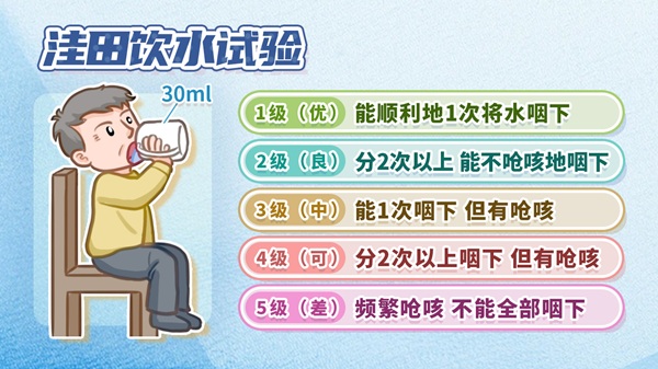比如老人已经出现了吸入性肺炎,或者因消瘦、严重的营养不良状态到医院来看病的时候。可能经过一系列检查,查不到其他原因的时候,才发现就是因为吞咽困难,老人的进食量减少了,这种情况是比较多见的。 因此,吞咽困难被称为老年人的“隐形杀手”。 二、“EAT-10”筛查量表,可帮老人自测吞咽困难! 在临床上可以通过简单的量表进行筛查,常用的是“EAT-10”筛查量表,当我们碰到高龄、衰弱的老人,或者是有帕金森病等神经系统退行性疾病的老人,可以通过EAT-10量表来初步评估。 “EAT-10”筛查量表包含10个问题,包括吞咽问题导致体重减轻、吞咽问题影响外出就餐、吞咽液体食物困难、吞咽固体食物困难、吞咽药片困难、吞咽疼痛、吞咽困难影响食欲、吞咽时食物卡在咽部、进食时咳嗽、吞咽时紧张。 以上每个问题都有0-4分的得分,0分代表无,4分代表程度最重,大家也可以用这个量表来自测,如果评判总分超过3分,我们就应该去做客观评估,在医生的指导下进行进一步的检查来明确诊断。 三、洼田饮水试验和吞咽造影检查是诊断吞咽困难的常用手段! 洼田饮水试验就是准备大概30毫升的温水,让患者在座位下喝水。 喝水的时候,评估的点是:一是一口或分几次能喝进去;二是喝水的过程中是否有呛咳,三是喝水的速度是否非常慢。不能一口喝进去,或喝得太慢,或喝水有呛咳,都提示存在咽部吞咽困难的情况。