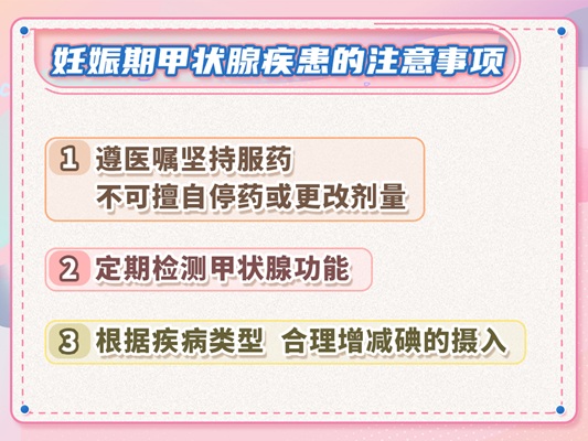 二、妊娠期甲状腺疾病的预防与认知误区 预防妊娠甲状腺疾病的发生,需从多方面入手。 首先,保持平和的心态和良好的情绪状态对于维护甲状腺功能至关重要。因为甲状腺疾病与遗传及自身免疫紊乱密切相关,而情绪紧张、焦虑等因素可能诱发或加重疾病。因此,孕妇在孕期应尽量避免精神刺激,保持积极乐观的心态。 其次,合理饮食也是预防甲状腺疾病的重要措施之一。孕妇应注意饮食均衡,适量摄入富含碘的食物,如海带、紫菜等海产品。同时,避免食用可能导致甲状腺肿大的食物和药物。 然而,在认识妊娠甲状腺疾病的过程中,仍存在一些误区。例如,部分孕妇担心药物对胎儿有不良影响而擅自停药;或者因对碘摄入量的认识不清而采取极端饮食方式,这些做法都是错误的。孕妇应树立正确的疾病观念,在医生指导下科学用药、合理饮食,以保障母体和胎儿的健康。 三、甲状腺疾病对人体的影响及特殊人群的管理 甲状腺疾病对人体的影响是多方面的。除了上述提到的对妊娠的不良影响外,甲状腺激素的异常还可能导致一系列全身症状,如心悸、手抖、体重变化等。此外,甲状腺疾病还具有一定的遗传易感性,但并非传统意义上的遗传性疾病。因此,即使家族中有甲状腺疾病史的人群也无需过度担心,只需在孕期加强监测和管理即可。