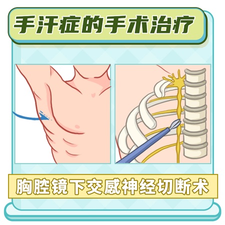 手汗症主要为一种先天性疾病,其发病机制与遗传因素密切相关。患者通常自幼年起即出现手掌多汗的症状。值得注意的是,尽管手汗症具有一定的遗传倾向,但它并非遗传性疾病,其遗传概率大约在30%左右。此外,手汗症的诊断主要依据主观感受,也就是手掌持续大量出汗给患者带来的痛苦,以及患者主动求治的意愿,而非特定的客观指标。 环境因素也会对手汗症的临床表现产生一定影响,例如在紧张、炎热或进行体力、脑力活动时,患者的出汗量会显著增加。手汗症患者在夜间睡眠时,手掌通常是干燥的;而在白天的平静状态下,手汗也可能减少或消失。 二、手汗症的治疗方法 手汗症的传统治疗方法包括口服药物、局部应用收敛剂或腐蚀剂以及注射肉毒杆菌毒素等,但这些方法的治疗效果往往有限且短暂。目前,经胸腔镜下的胸交感神经切断术被认为是治疗手汗症最有效的方法。该手术通过切断支配手掌汗腺的交感神经分支来达到减少手掌出汗的目的。 具体而言,手术会在患者腋下切开一个约5-10毫米的小口,利用胸腔镜进入胸腔内,精确地切断目标神经。如果一切顺利的话,单侧手术时间大约为5-10分钟,双侧手术总时长不超过20分钟。患者在手术期间处于全身麻醉状态,因此不会感到任何不适。