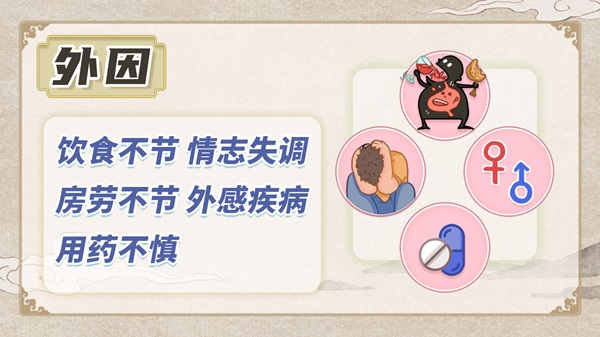 外因就是饮食不节伤了脾胃,时间长了,因为五脏都是相关的,就会伤到肾脏。 或者是情志失调,情志不畅以后脏腑失和,气血循行不畅、瘀滞,就会产生对脏器的损伤,特别是对肾脏的损伤。 另外还有房劳不节,就是房劳过度可能也会直接引起肾脏的损伤。 还有一些外感,外感就是风、寒、暑、湿、燥、火,过度的外感发生疾病以后,损伤肾脏。 还有一些是药毒引发,有些人吃药不慎,比如滥用抗生素或者是抗肿瘤的药物,或者是非甾体类抗炎药等等,一些药物产生药毒,伤了肾脏而发生慢性肾衰竭。