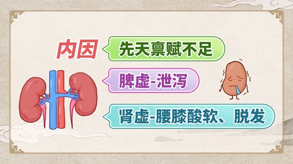 比如这个患者主要表现是比较明显的水肿,在中医病名就归属于水肿了; 如果这个患者的表现是尿少、尿闭,恶心、呕吐这些表现的时候,中医就归属到关格; 如果这个患者出现多个系统的症状,我们就说是毒素潴留引发的,就归属于溺毒这样一个病名。 二、中医认为导致慢性肾衰竭的原因是什么? 中医的原因可以归为内因和外因。 内因就是先天禀赋不足,就是这个人先天的脏器功能有虚弱的地方。 比如有的患者长期有脾虚的表现,长期泄泻,时间长了,会影响到肾脏,发生慢性肾衰竭。有的患者先天肾虚,容易腰膝酸软、脱发。这就是先天禀赋不足。