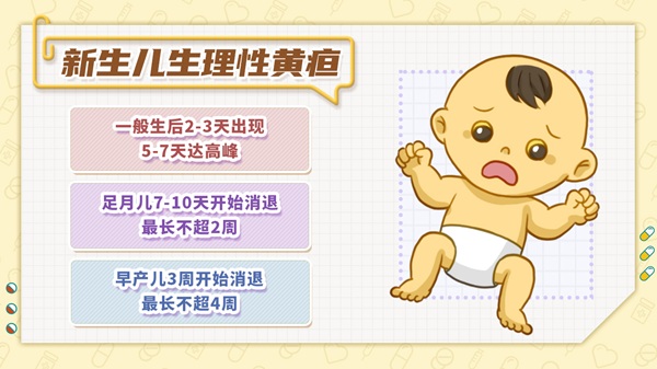 新生儿黄疸有生理性和病理性之分。生理性黄疸一般在生后2-3天开始出现,5-7天达到高峰。对足月儿来讲,一般7-10天消退,最长不超过2周;对于早产儿来讲,一般3周消退,最长不超过4周。