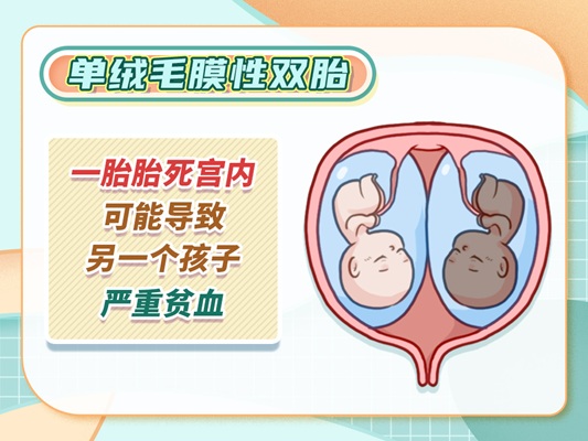 所以对于单绒毛膜性双胎,如果发生了一胎胎死宫内,后续我们要定期监测存活胎儿的脑部发育问题,以及是否有贫血的问题。这些问题都可以通过超声检查,以及胎儿脑部的磁共振检查来发现。 三、双胎妊娠的胎儿出现脐带绕颈、脐带缠绕危险吗? 一般双胎妊娠中,一胎发生脐带绕颈,跟单胎发生脐带绕颈,其实没有什么太大的区别。 应该说更加危险的,指的是单绒毛膜、单羊膜囊的双胎妊娠。两个之间没有隔膜,住在一个“房间”里面,这个时候就不仅仅是脐带绕颈的问题了,而更重要的是脐带互相缠绕的问题,也就是两个胎儿的脐带绕在一起,所以这种情况其实是最危险的。